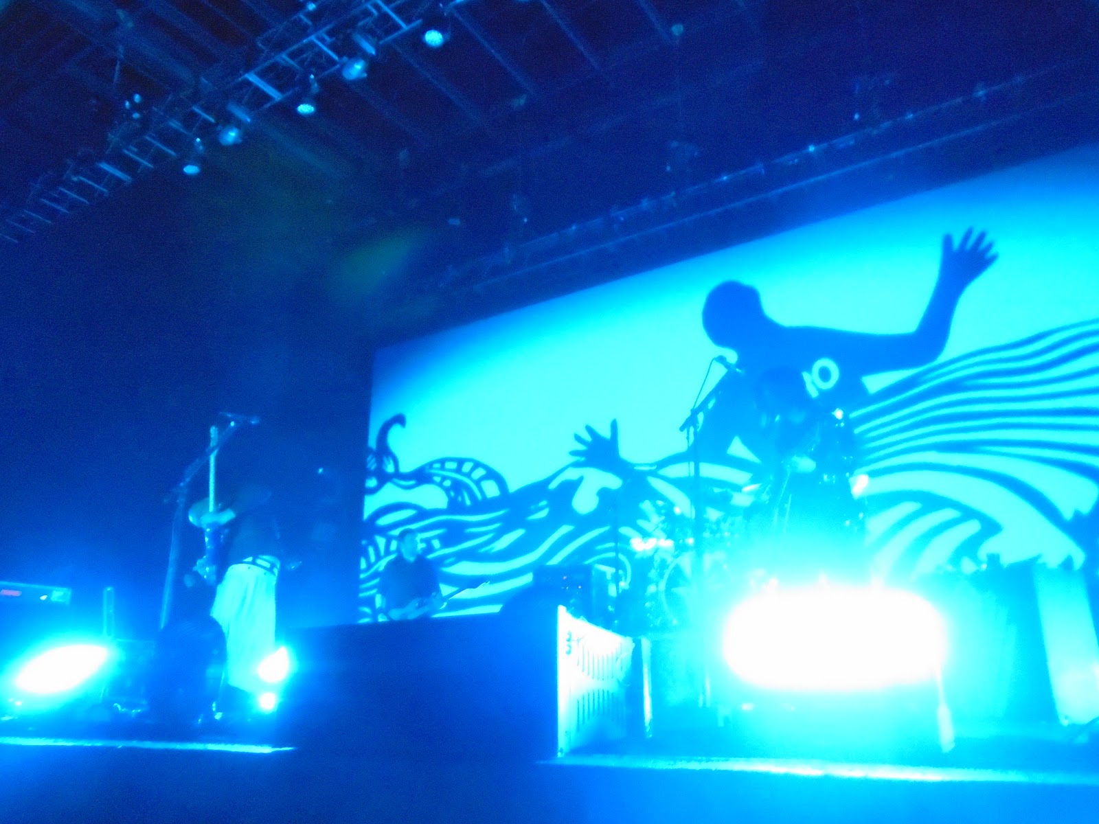 Also unlike this summer's tour, which ran a mammoth three hours and fifteen minutes, this new tour is a TIGHT two hours, including two encores. I guess that if I could utilize a cinematic analogy, I would say that if The Smashing Pumpkins' summer tour was more akin to a classic David Lean or Francis Ford Coppola epic, an experience that stretched out luxuriously and provided the requisite peaks and valleys to tell the impressionistic story of the band 's history, then this current tour is more like a classic Steven Spielberg blockbuster, furiously paced, relentless in its energy yet equal to the summer tour's overwhelming quality in its cumulative effect.